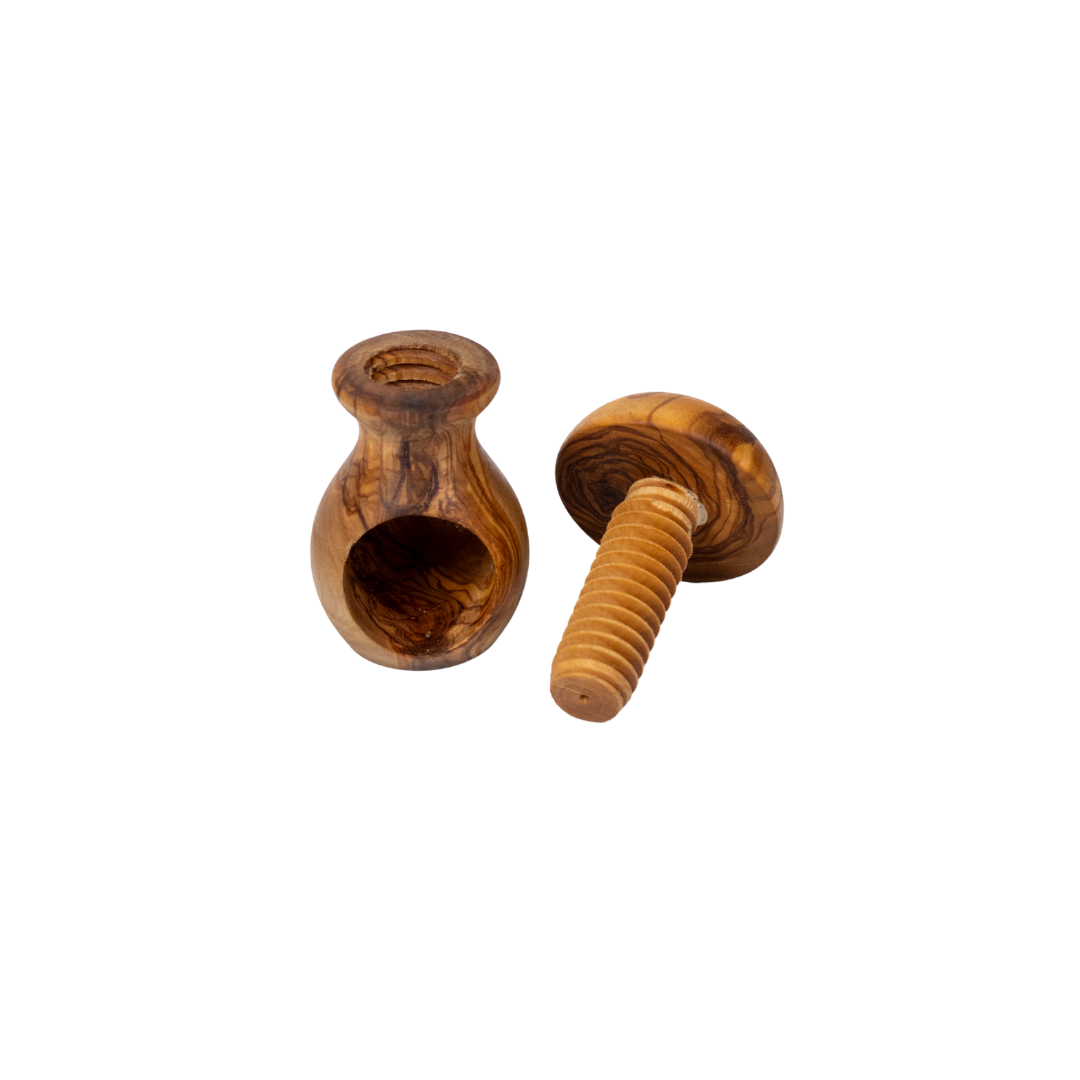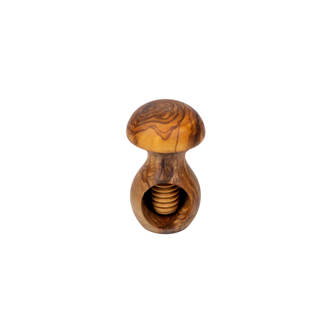 A beautiful demonstration of old-world mechanical ingenuity, the Heritage Screw-Top Nutcracker is hand-turned from the densest heartwood of the Tunisian olive tree. This two-piece set features a hollow, ergonomic base and a precision-threaded wooden screw. The multi-tonal grain of the olive wood, ranging from soft cream to deep, dark amber wraps around the curved silhouette, making this functional tool a small-scale sculptural artifact.